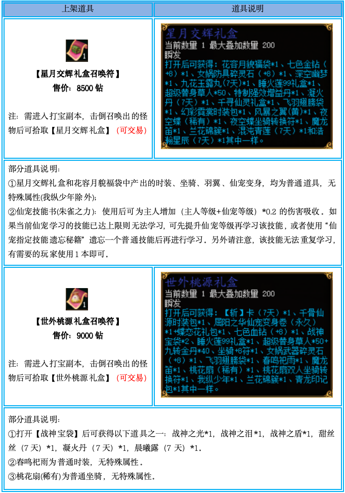 1、【星月交辉礼盒召唤符】和【世外桃源礼盒召唤符】仅限钻石商城购买,通过摆摊购买、互相交易、邮件领取、拍卖购买等非钻石商城购买方式获得的,不计算在活动内;