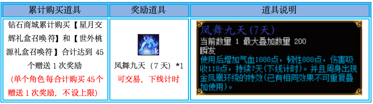 2、本活动单个角色可重复进行参与,例如角色A在钻石商城购买了45个【星月交辉礼盒召唤符】,45个【世外桃源礼盒召唤符】,合计达到90个,则活动结束后可获得2个“凤舞九天(7天)”的奖励;