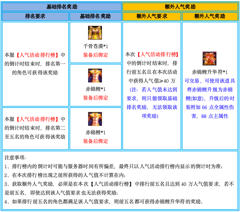 2、本活动开启前,角色已经获得的人气值不会计算在内,必须要在活动开启后获得的人气值才为有效;