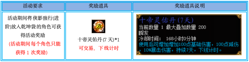2、必须是在活动期间将侠影独行(进阶)放入乾坤袋才符合要求,非本次活动期间放入的无法获得奖励;