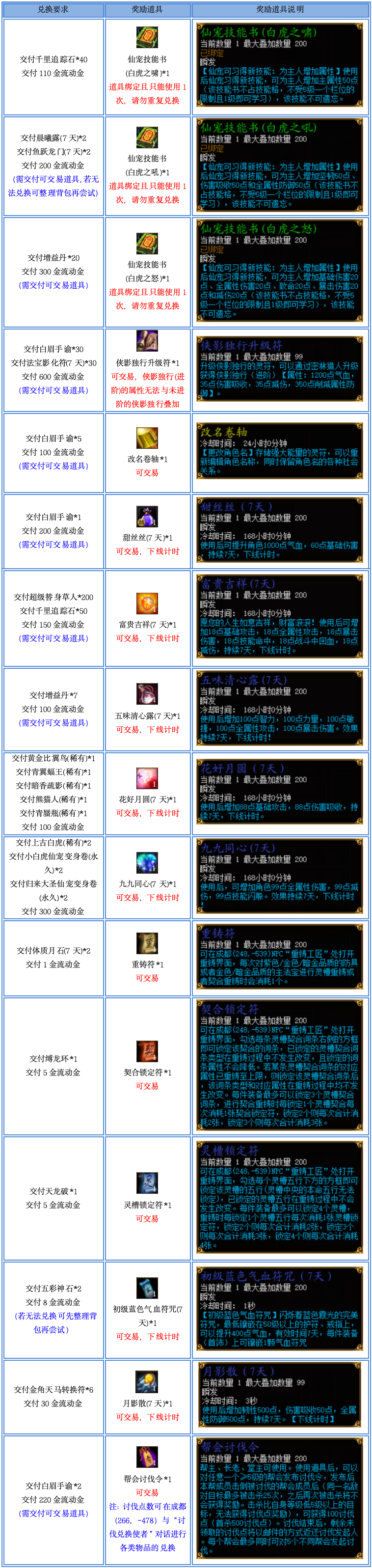 3、兑换获得的道具中,除【白虎之啸】、【白虎之吼】、【白虎之怒】这三本技能书为绑定,其余道具均可进行交易;